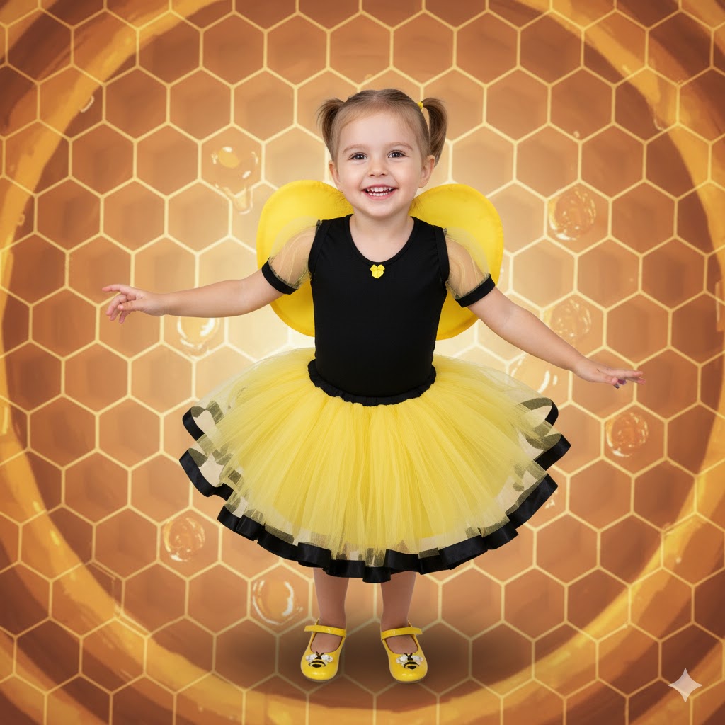 Tamanho M (5-7 anos) - Body: Comprimento 46 cm, Cavalo 39 cm, Busto 58 cm, Cintura 48 cm. Saia: Comprimento 28 cm, Cintura 54 cm.