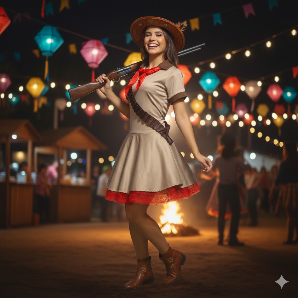 Descrição de Acessórios: Vestido, Cinto, Cartucheira, Lenço, Chapéu e Espingarda.