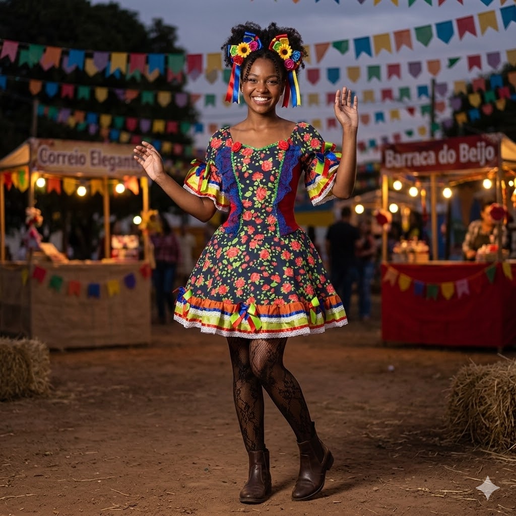Descrição do Produto: Vestido Junino Luxo Florido com Rendas