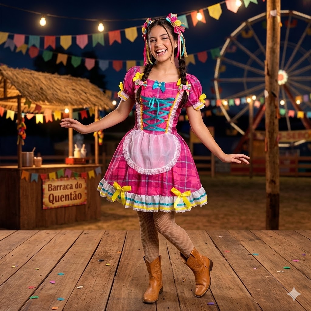 Descrição do Produto: Vestido Junino Luxo Trançado com Avental